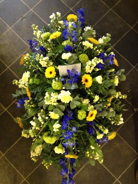 A bold mix of yellow and blue flowers complimented by green in this summery coffin spray.