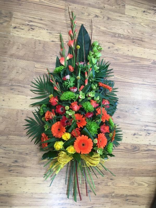 A zingy colourful single ended spray in foam with the addition of natural stems.