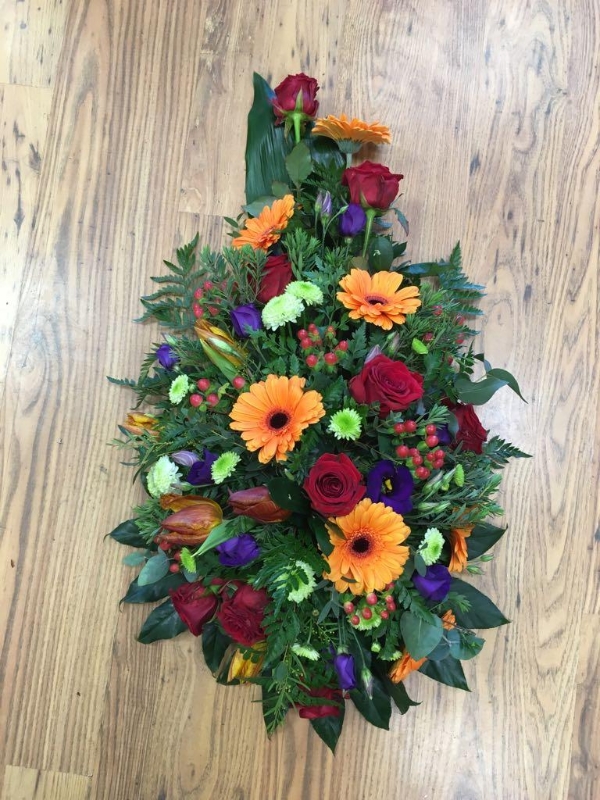 Autumn reds, dark purples and oranges including gerberas, roses and lisianthus with complimentary mixed foliages come together in this autumnal spray.