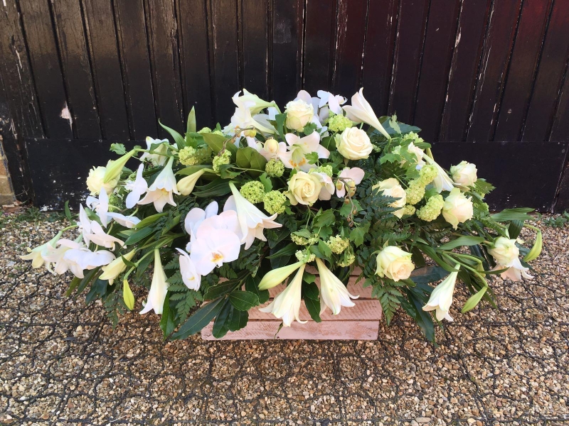white longiflorum lily, roses and white orchids with complimentary foliage create a simple yet stunning display