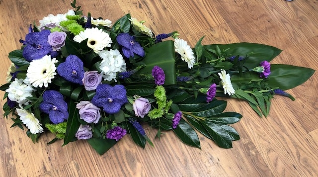 This luxurious single ended features vanda orchids and roses in shades of purples and white.