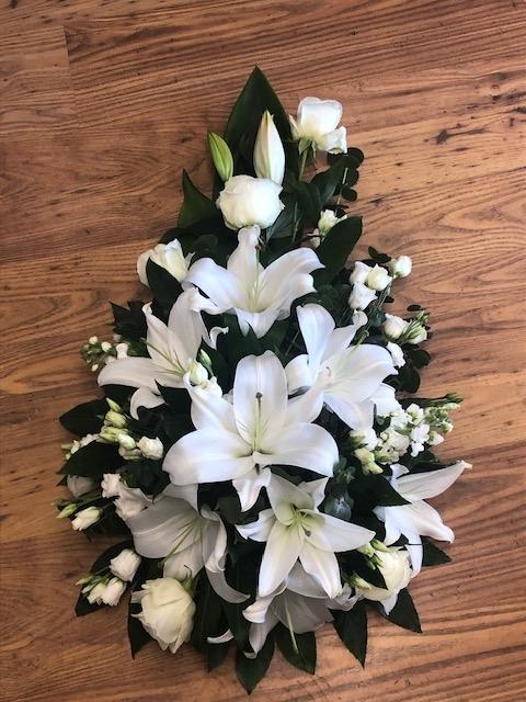 An elegant mix of white flowers including lily and roses in this single ended design.
