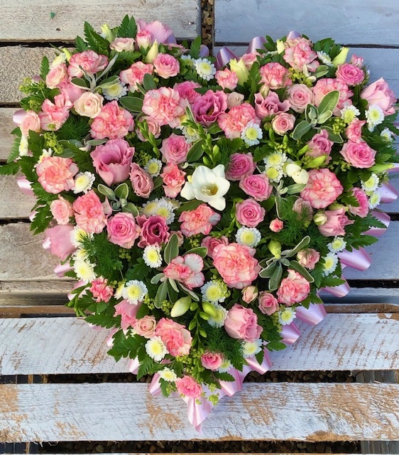 Mixed flowers and foliages including roses and freesia make this pretty heart a beautiful tribute.