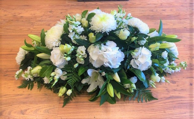 A mixed selection of white flowers including bloom chrysanths and lilies with mixed foliages.