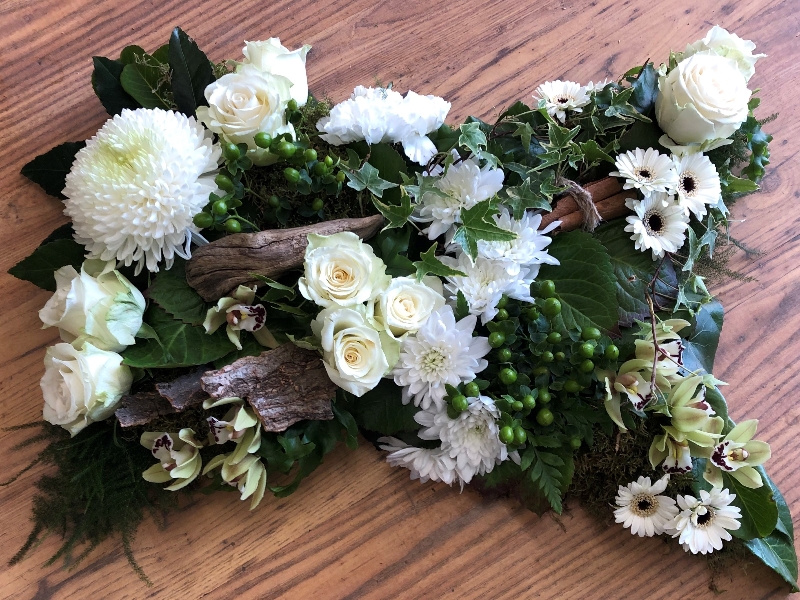 woodland style pillow including bark, mosses and grouped fresh blooms in white and green