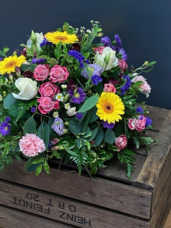 Mixed blooms in a natural domed arrangement in your colour choice.