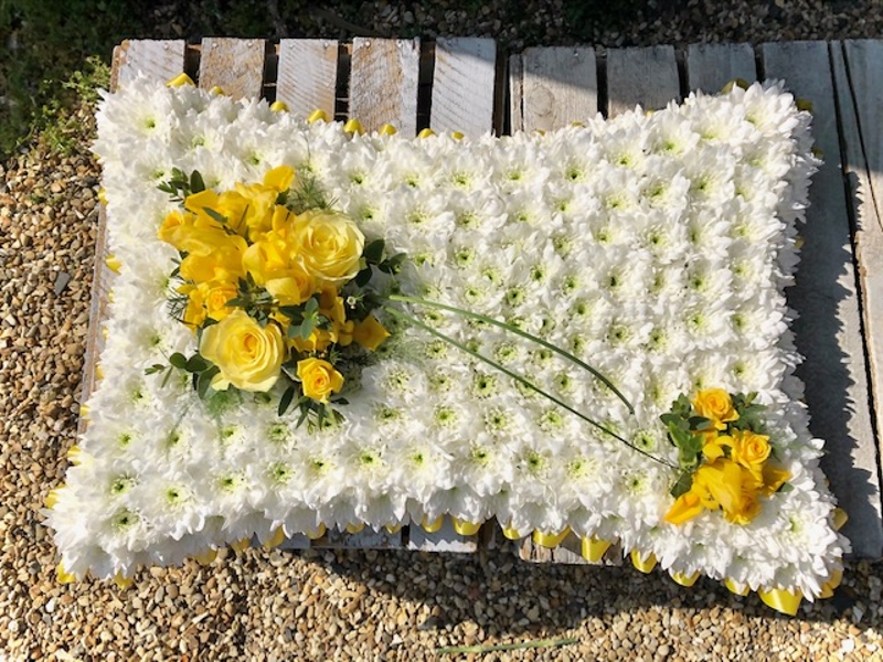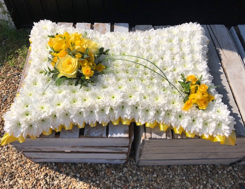 A traditional pillow design based in white with a choice of ribbon and matching spray colour.