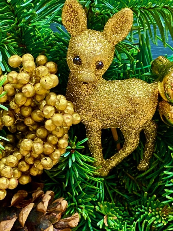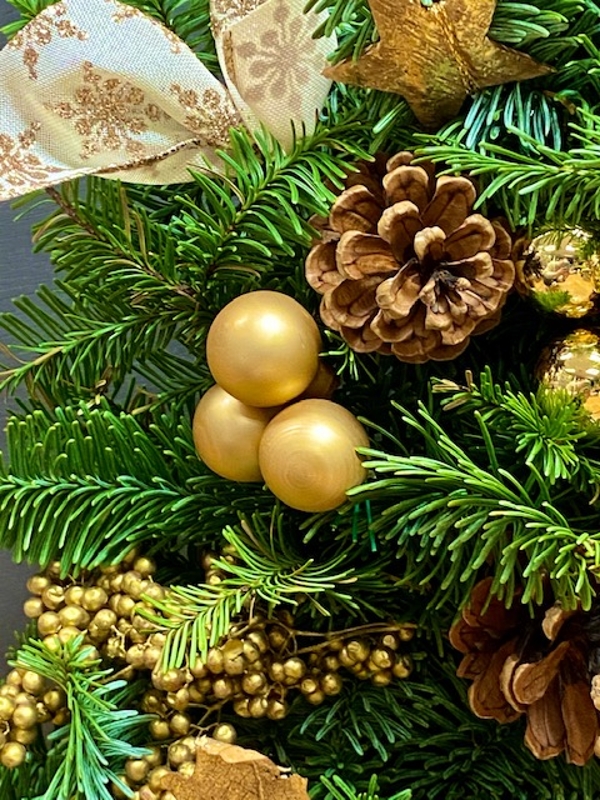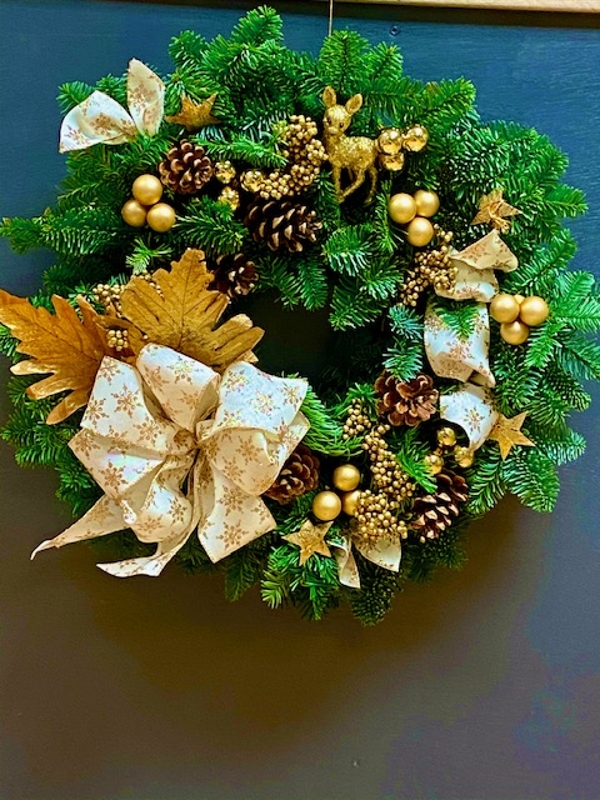 Glitz and glam is the theme for this wreath including stunning  dried gold oak leaves, gold coconut shell stars, cones, gold baubles and pepper berries.