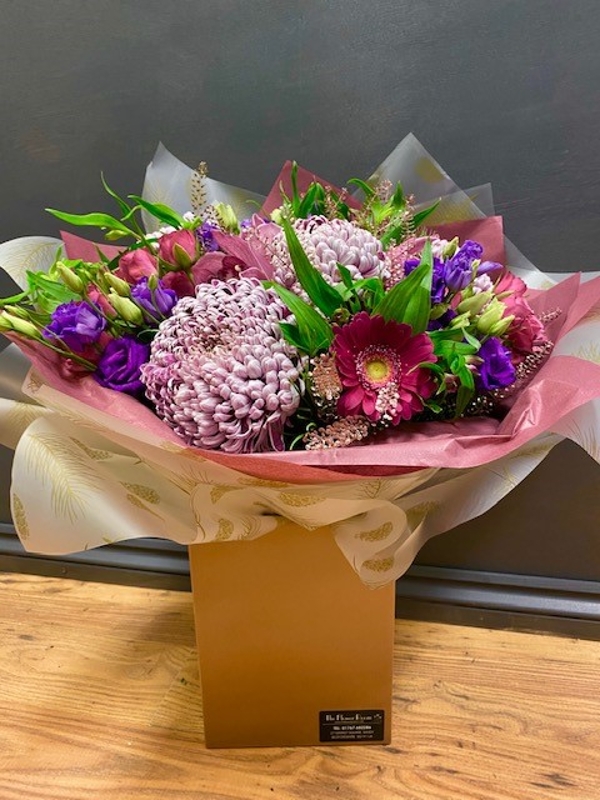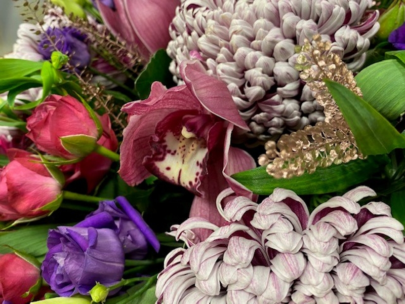 Stunning bloom chrysanthemum, orchids, lisianthus and spray roses feature in this luxurious hand tied bouquet in plum tones.