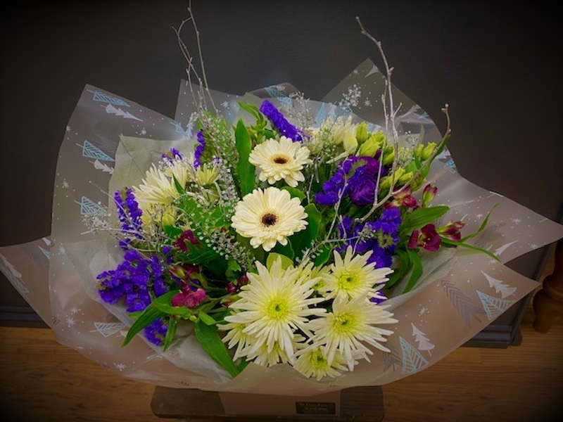 A beautiful frosty collection of blooms featuring florist choice in whites, purples and silver tones.