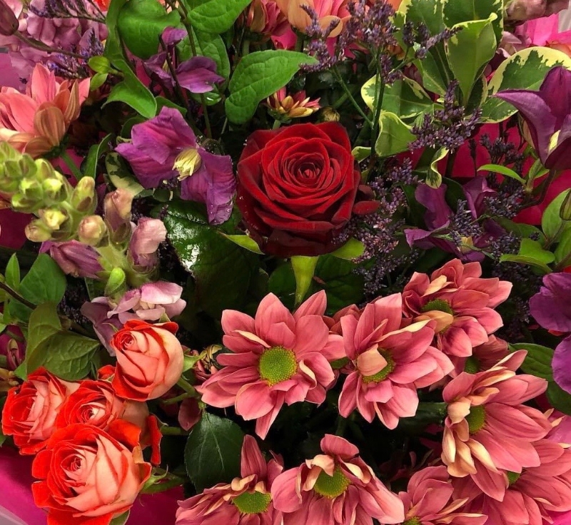 Florist choice of blooms in valentine colours wrapped in kraft paper ready to arrange in a vase.