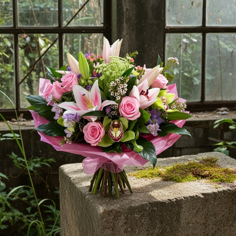 A luxury choice of blooms including cymbidium orchids, lily and mixed pretty blooms , handtied, giftwrapped and presented in water.