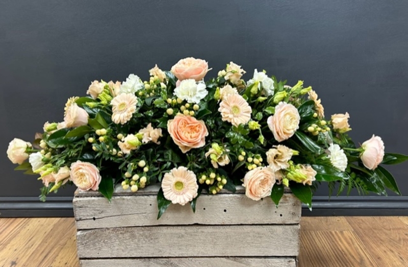A pretty selection of flowers in warm peach, cream and white tones.