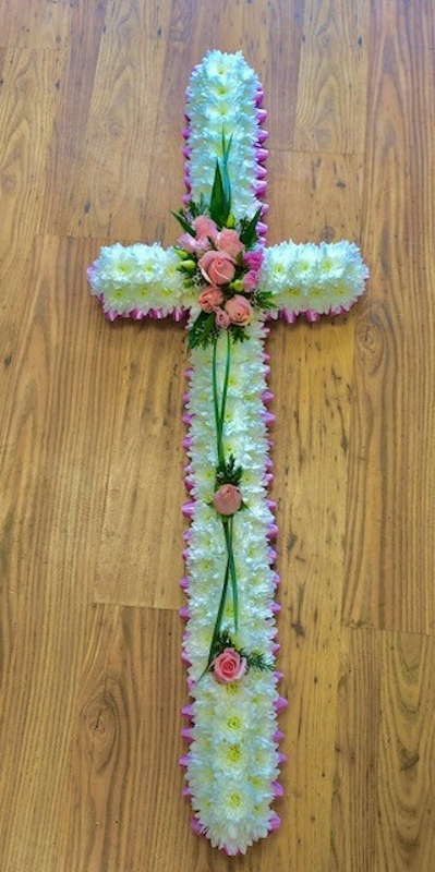 Classic cross design based in white flowers with coloured ribbon and matching spray.