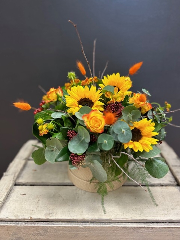 Autumn glow fills this hatbox design including sunny sunflowers and orange roses