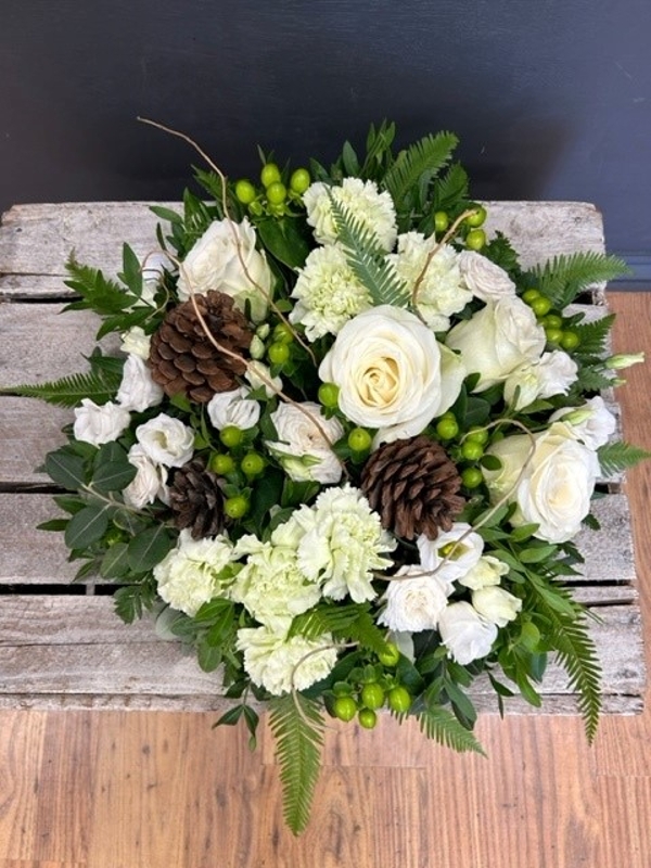 A woodland themed posy pad design made with a compostable base in whites and greens and a woodland theme with ferns and cones.