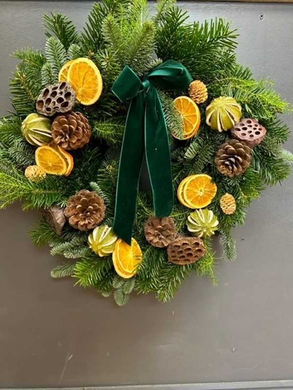A traditional mix of sliced oranges, whole green oranges, large cones, lotus heads and small cones finished with a simple bow nestled amongst traditional Christmas foliages.