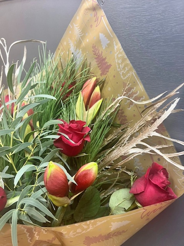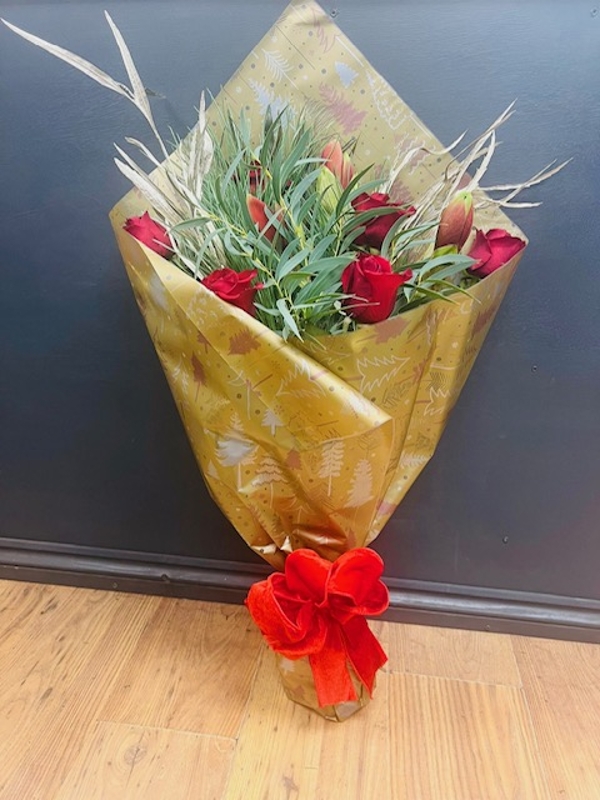 A simple but stunning wrap of luxurious long stem red roses, amaryllis and festive foliages.