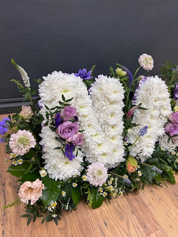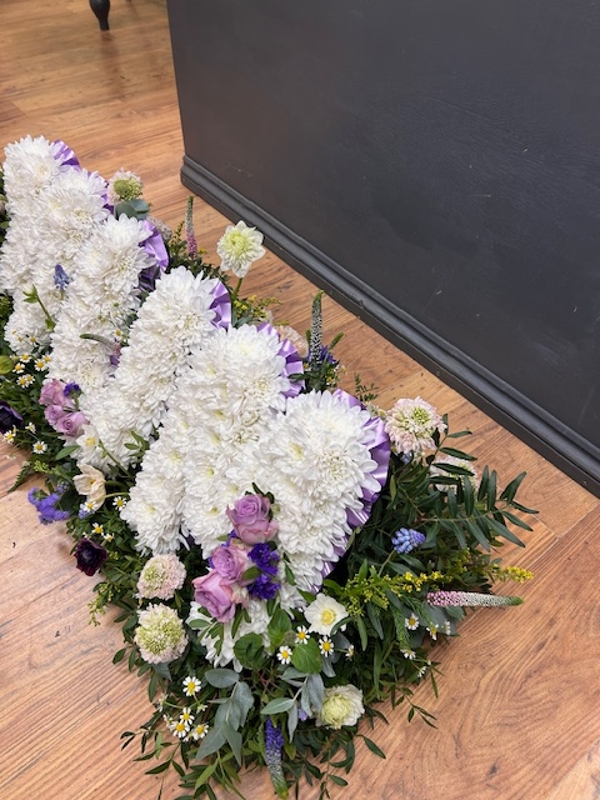 Nestled onto a meadow style base piece, giving a softer more informal look to a traditional favourite tribute.