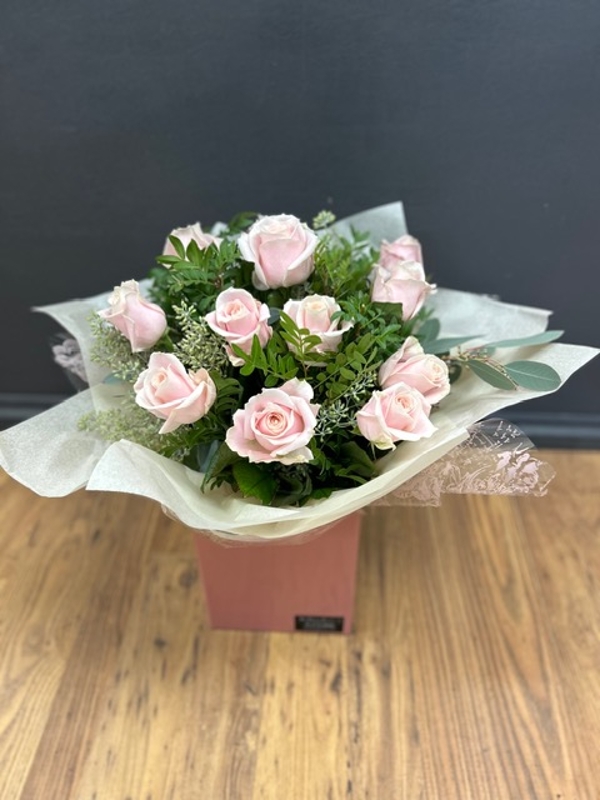12 long stem pink roses  with seasonal fresh foliages handtied and giftwrapped in water