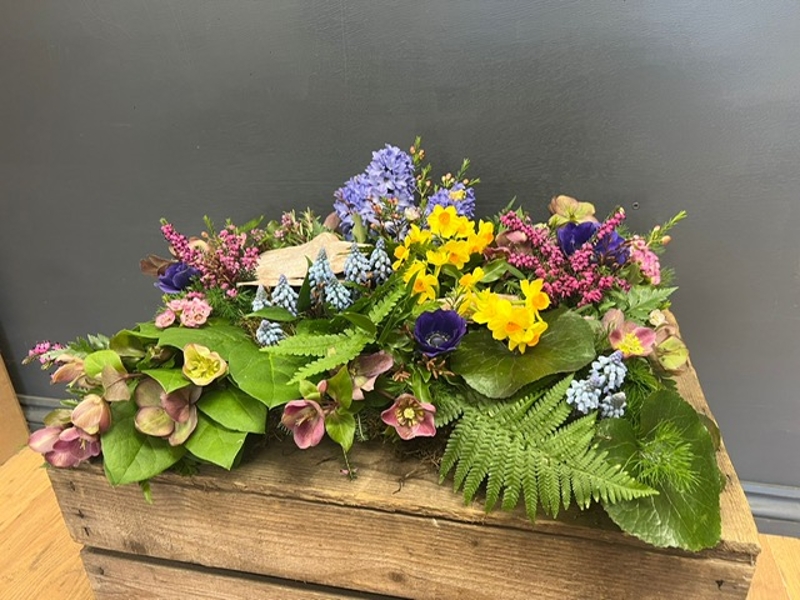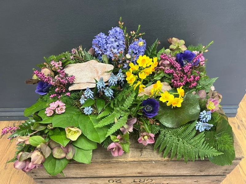 seasonal mix of woodland themed flowers and foliages with bark pieces to give the effect of a growing woodland floor